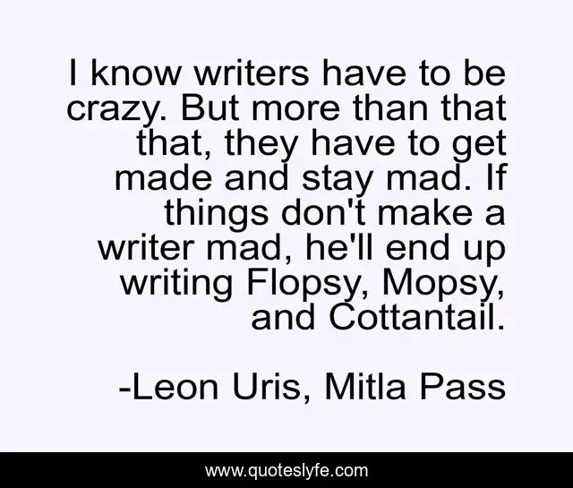 This page presents the quote "I know writers have to be crazy. But more than that that, they have to get made and stay mad. If things don't make a writer mad, he'll end up writing Flopsy, Mopsy, and Cottantail.". Author of this quote is Leon Uris, Mitla Pass. This quote is about anger, enthusiasm, inspirational, writing,.
