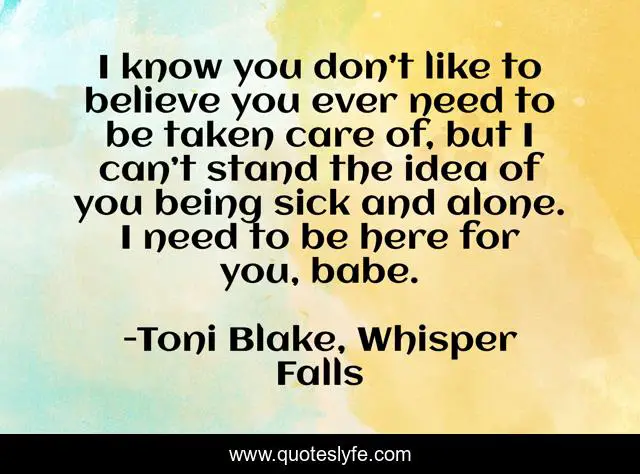 This page presents the quote "I know you don’t like to believe you ever need to be taken care of, but I can’t stand the idea of you being sick and alone. I need to be here for you, babe.". Author of this quote is Toni Blake, Whisper Falls. This quote is about romance, contemporary-romance,.