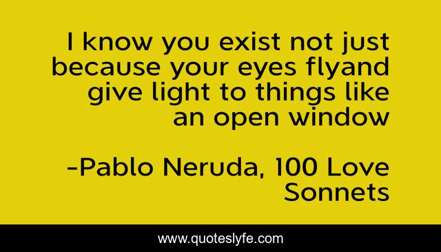 This page presents the quote "I know you exist not just because your eyes flyand give light to things like an open window". Author of this quote is Pablo Neruda, 100 Love Sonnets. This quote is about eyes, love, light, openness, open, affection,.