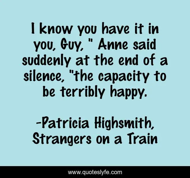 This page presents the quote "I know you have it in you, Guy, " Anne said suddenly at the end of a silence, "the capacity to be terribly happy.". Author of this quote is Patricia Highsmith, Strangers on a Train. This quote is about patricia-highsmith, human, strangers-on-a-train, strangers, terribly, train, silence, truth, happiness,.