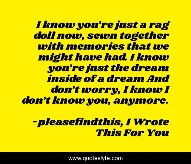 This page presents the quote "I know you’re just a rag doll now, sewn together with memories that we might have had. I know you’re just the dream inside of a dream And don’t worry, I know I don’t know you, anymore.". Author of this quote is pleasefindthis, I Wrote This For You. This quote is about relationships, forgetting-the-past, love, break-ups, memories, endings, forgetting, affection,.