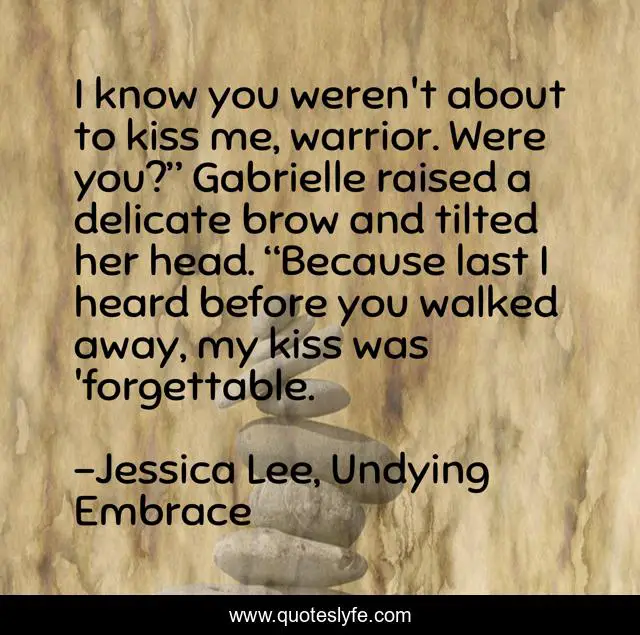 This page presents the quote "I know you weren't about to kiss me, warrior. Were you?” Gabrielle raised a delicate brow and tilted her head. “Because last I heard before you walked away, my kiss was 'forgettable.". Author of this quote is Jessica Lee, Undying Embrace. This quote is about jessica-lee, gabrielle-stevens, paranormal-romance, paranormal-romance-series, vampire-romance,.