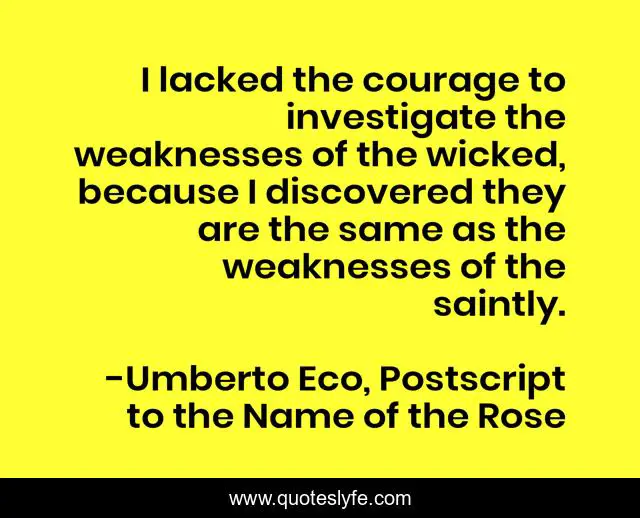 This page presents the quote "I lacked the courage to investigate the weaknesses of the wicked, because I discovered they are the same as the weaknesses of the saintly.". Author of this quote is Umberto Eco, Postscript to the Name of the Rose. This quote is about weakness, courage,.