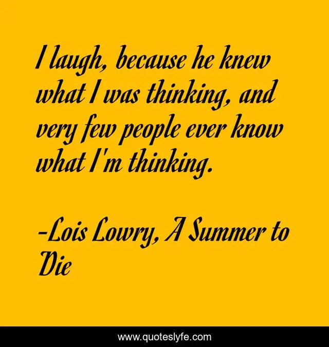 This page presents the quote "I laugh, because he knew what I was thinking, and very few people ever know what I'm thinking.". Author of this quote is Lois Lowry, A Summer to Die. This quote is about love, relationship, thoughts, understading, bestfriend, friends, affection,.