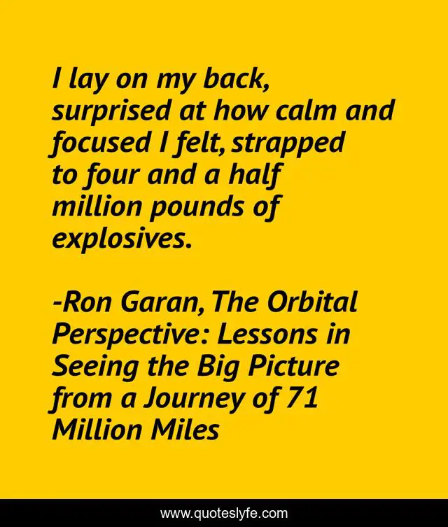 This page presents the quote "I lay on my back, surprised at how calm and focused I felt, strapped to four and a half million pounds of explosives.". Author of this quote is Ron Garan, The Orbital Perspective: Lessons in Seeing the Big Picture from a Journey of 71 Million Miles. This quote is about space-ship, space, iss, astronaut, international-space-station, outer-space, space-exploration, explosives,.