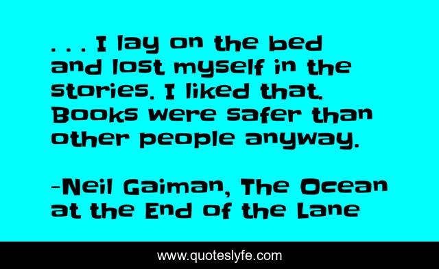 This page presents the quote ". . . I lay on the bed and lost myself in the stories. I liked that. Books were safer than other people anyway.". Author of this quote is Neil Gaiman, The Ocean at the End of the Lane. .