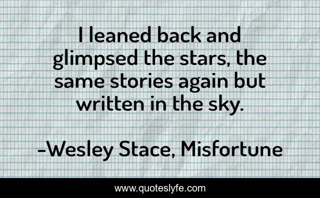 This page presents the quote "I leaned back and glimpsed the stars, the same stories again but written in the sky.". Author of this quote is Wesley Stace, Misfortune. This quote is about misfortune, wesley-stace, stars,.