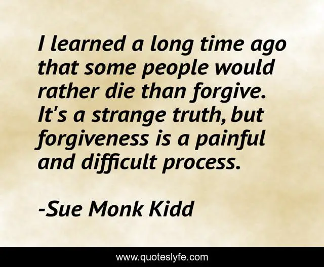 This page presents the quote "I learned a long time ago that some people would rather die than forgive. It's a strange truth, but forgiveness is a painful and difficult process.". Author of this quote is Sue Monk Kidd. This quote is about time, truth, people,.