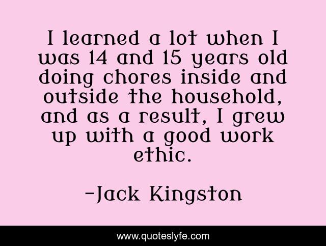 This page presents the quote "I learned a lot when I was 14 and 15 years old doing chores inside and outside the household, and as a result, I grew up with a good work ethic.". Author of this quote is Jack Kingston. This quote is about work ethic, good, good work,.