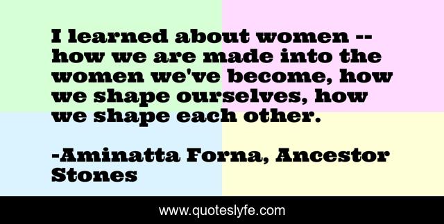 This page presents the quote "I learned about women -- how we are made into the women we've become, how we shape ourselves, how we shape each other.". Author of this quote is Aminatta Forna, Ancestor Stones. This quote is about life-changes, women,.