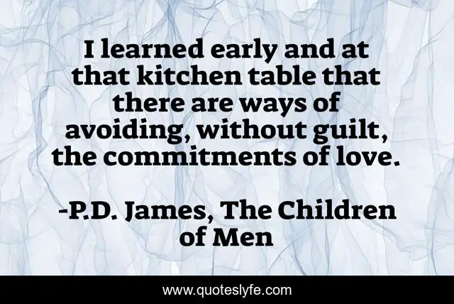 This page presents the quote "I learned early and at that kitchen table that there are ways of avoiding, without guilt, the commitments of love.". Author of this quote is P.D. James, The Children of Men. This quote is about theo, humor, humour, avoid, love, affection,.