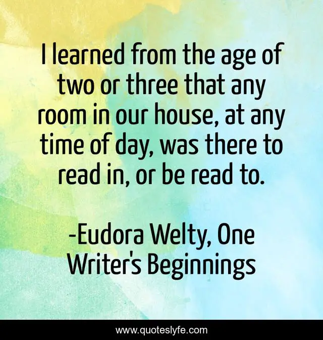 This page presents the quote "I learned from the age of two or three that any room in our house, at any time of day, was there to read in, or be read to.". Author of this quote is Eudora Welty, One Writer's Beginnings. This quote is about books, creativity, reading, writing,.