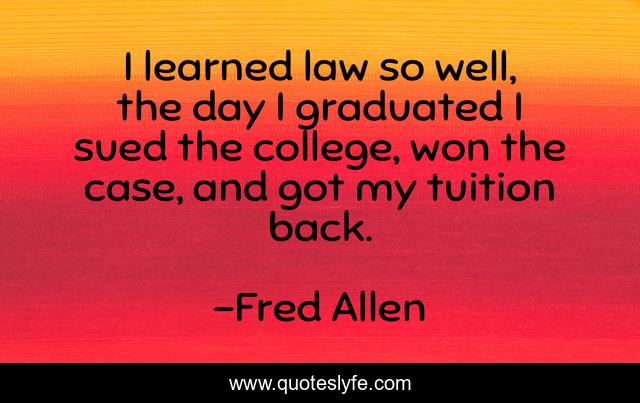 This page presents the quote "I learned law so well, the day I graduated I sued the college, won the case, and got my tuition back.". Author of this quote is Fred Allen. This quote is about law, college, day,.