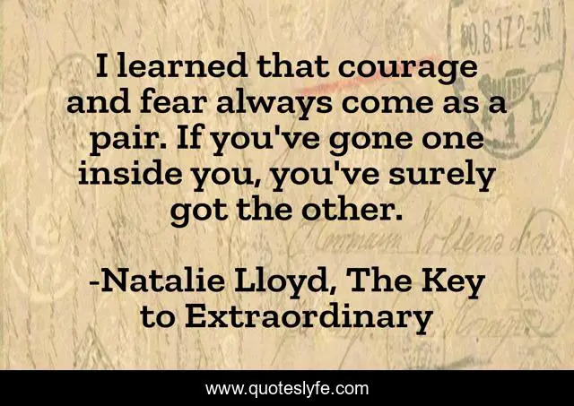 This page presents the quote "I learned that courage and fear always come as a pair. If you've gone one inside you, you've surely got the other.". Author of this quote is Natalie Lloyd, The Key to Extraordinary. This quote is about fear, courage,.