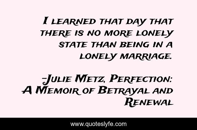 This page presents the quote "I learned that day that there is no more lonely state than being in a lonely marriage.". Author of this quote is Julie Metz, Perfection: A Memoir of Betrayal and Renewal. This quote is about lonely, marriage,.
