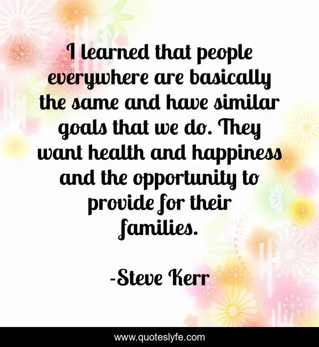 This page presents the quote "I learned that people everywhere are basically the same and have similar goals that we do. They want health and happiness and the opportunity to provide for their families.". Author of this quote is Steve Kerr. This quote is about goals, happiness,.