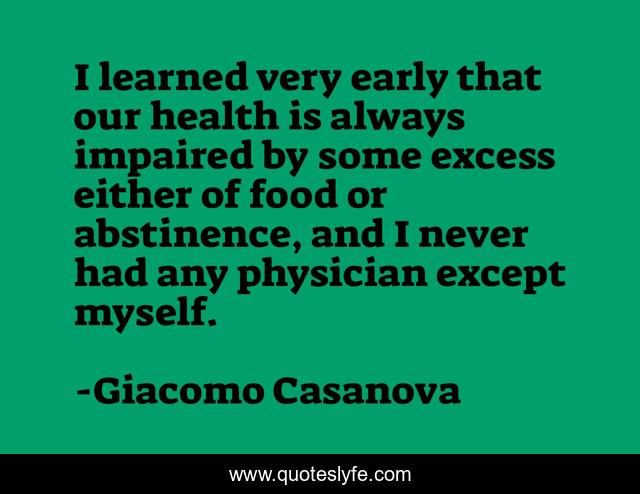 This page presents the quote "I learned very early that our health is always impaired by some excess either of food or abstinence, and I never had any physician except myself.". Author of this quote is Giacomo Casanova. This quote is about physician, myself, health,.