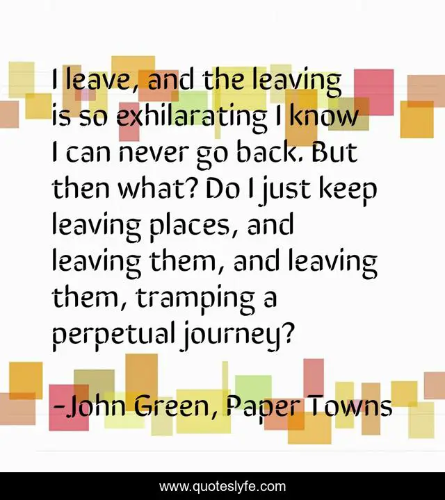 This page presents the quote "I leave, and the leaving is so exhilarating I know I can never go back. But then what? Do I just keep leaving places, and leaving them, and leaving them, tramping a perpetual journey?". Author of this quote is John Green, Paper Towns. This quote is about leaving, john-green, paper-towns, sad,.