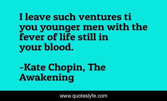 This page presents the quote "I leave such ventures ti you younger men with the fever of life still in your blood.". Author of this quote is Kate Chopin, The Awakening. This quote is about kate-chopin, youth, the-awakening, mgg, adventures,.