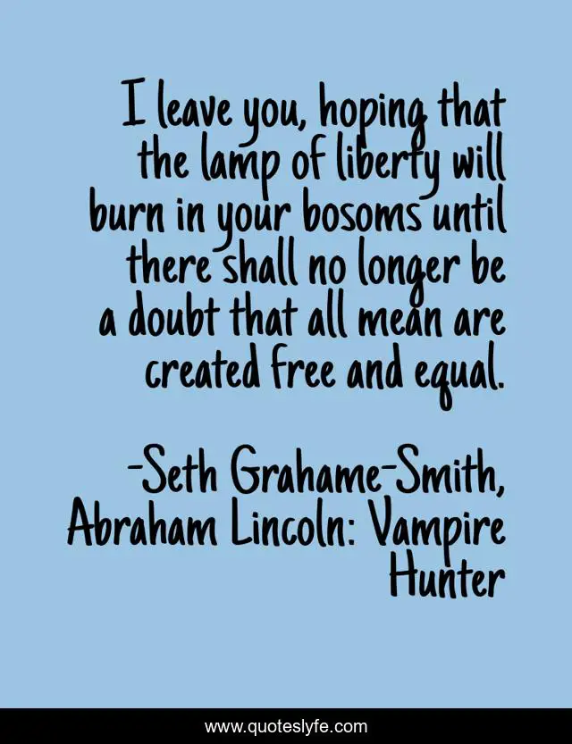 This page presents the quote "I leave you, hoping that the lamp of liberty will burn in your bosoms until there shall no longer be a doubt that all mean are created free and equal.". Author of this quote is Seth Grahame-Smith, Abraham Lincoln: Vampire Hunter. This quote is about freedom, equality, abraham-lincoln,.