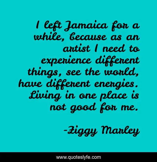 This page presents the quote "I left Jamaica for a while, because as an artist I need to experience different things, see the world, have different energies. Living in one place is not good for me.". Author of this quote is Ziggy Marley. This quote is about world, good, artist,.