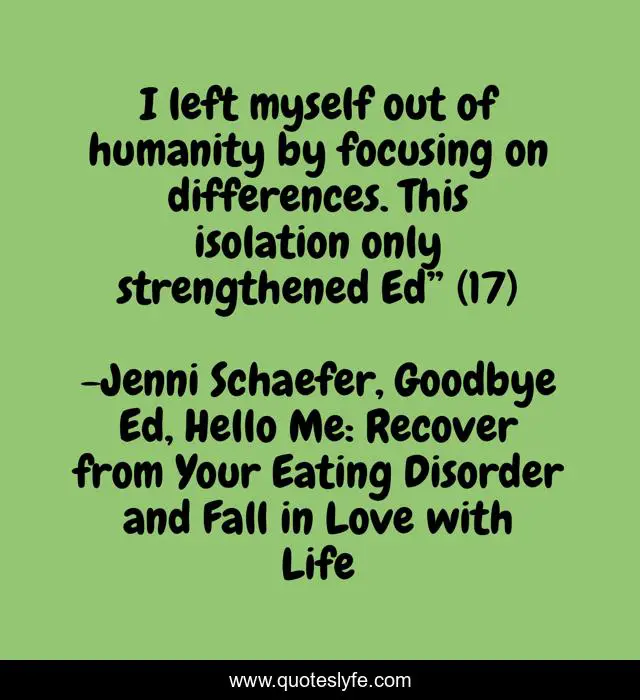 This page presents the quote "I left myself out of humanity by focusing on differences. This isolation only strengthened Ed” (17)". Author of this quote is Jenni Schaefer, Goodbye Ed, Hello Me: Recover from Your Eating Disorder and Fall in Love with Life. This quote is about eating-disorder, differences, recovery,.