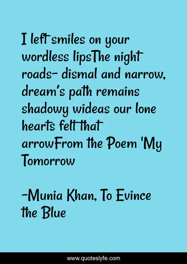 This page presents the quote "I left smiles on your wordless lipsThe night roads- dismal and narrow, dream’s path remains shadowy wideas our lone hearts felt that arrowFrom the Poem 'My Tomorrow". Author of this quote is Munia Khan, To Evince the Blue. This quote is about poem, lonely, love, smiles, shadowy, lover, poetry, lips, lovers,.