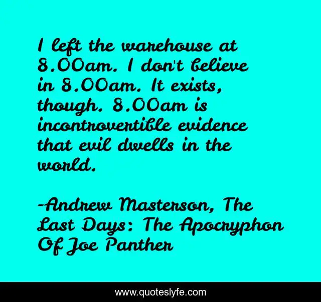 "Andrew Masterson, The Last Days: The Apocryphon Of Joe Panther Quotes." Quoteslyfe.com, 2025. Fri. 05 Dec. 2025. <https://www.quoteslyfe.com/quote/I-left-the-warehouse-at-8-00am-55883>.