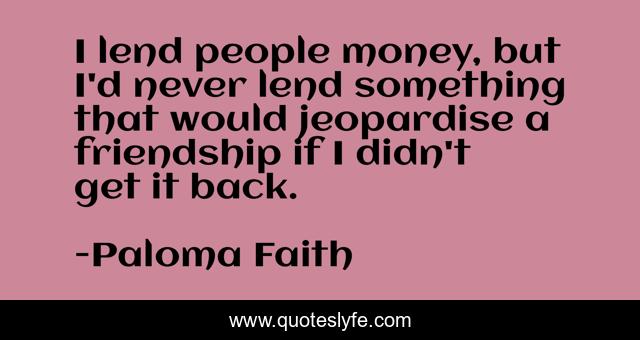 This page presents the quote "I lend people money, but I'd never lend something that would jeopardise a friendship if I didn't get it back.". Author of this quote is Paloma Faith. This quote is about money, back, people,.