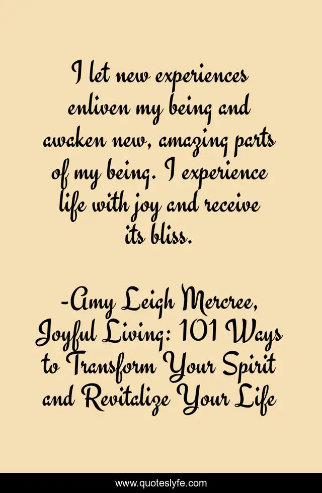 This page presents the quote "I let new experiences enliven my being and awaken new, amazing parts of my being. I experience life with joy and receive its bliss.". Author of this quote is Amy Leigh Mercree, Joyful Living: 101 Ways to Transform Your Spirit and Revitalize Your Life. This quote is about life, quotes-de-la-vida, amy-leigh-mercree, joy, joyful-living, quotes-tumblr, bliss, experience, inspirational,.