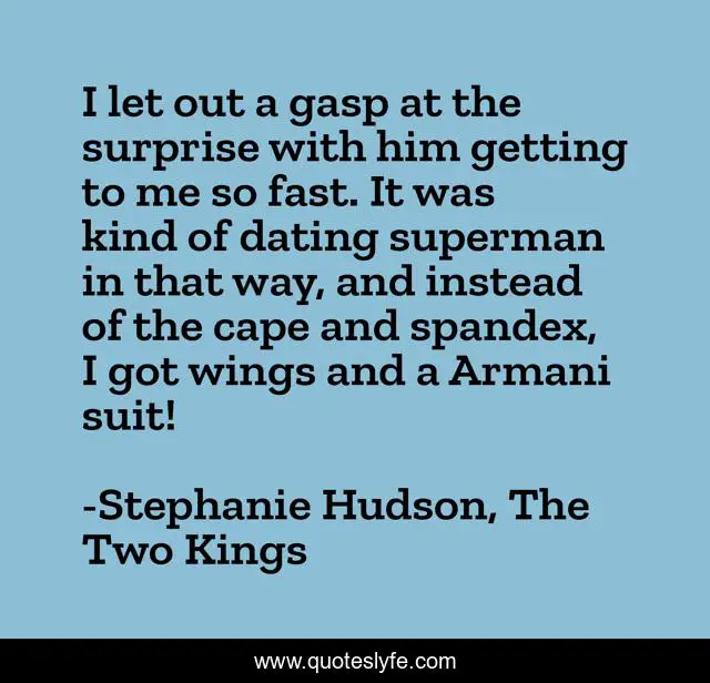 This page presents the quote "I let out a gasp at the surprise with him getting to me so fast. It was kind of dating superman in that way, and instead of the cape and spandex, I got wings and a Armani suit!". Author of this quote is Stephanie Hudson, The Two Kings. .