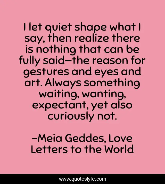 This page presents the quote "I let quiet shape what I say, then realize there is nothing that can be fully said—the reason for gestures and eyes and art. Always something waiting, wanting, expectant, yet also curiously not.". Author of this quote is Meia Geddes, Love Letters to the World. This quote is about art, quiet, silence,.