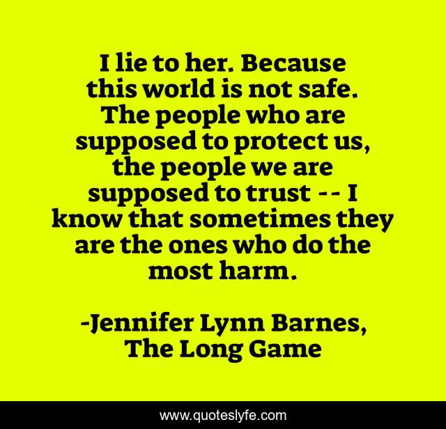 This page presents the quote "I lie to her. Because this world is not safe. The people who are supposed to protect us, the people we are supposed to trust -- I know that sometimes they are the ones who do the most harm.". Author of this quote is Jennifer Lynn Barnes, The Long Game. This quote is about harm, trust, unsafe, protection,.