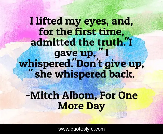 This page presents the quote "I lifted my eyes, and, for the first time, admitted the truth."I gave up, " I whispered."Don't give up, " she whispered back.". Author of this quote is Mitch Albom, For One More Day. This quote is about lessons, faith, quotes,.