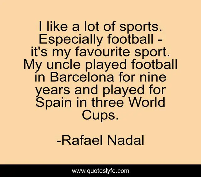 This page presents the quote "I like a lot of sports. Especially football - it's my favourite sport. My uncle played football in Barcelona for nine years and played for Spain in three World Cups.". Author of this quote is Rafael Nadal. This quote is about world, football, three,.