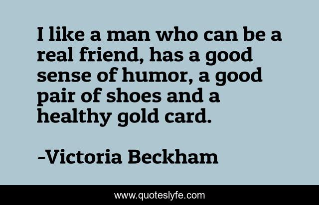 This page presents the quote "I like a man who can be a real friend, has a good sense of humor, a good pair of shoes and a healthy gold card.". Author of this quote is Victoria Beckham. This quote is about good, shoes, gold,.