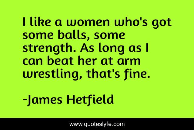 This page presents the quote "I like a women who's got some balls, some strength. As long as I can beat her at arm wrestling, that's fine.". Author of this quote is James Hetfield. This quote is about wrestling, long, women,.