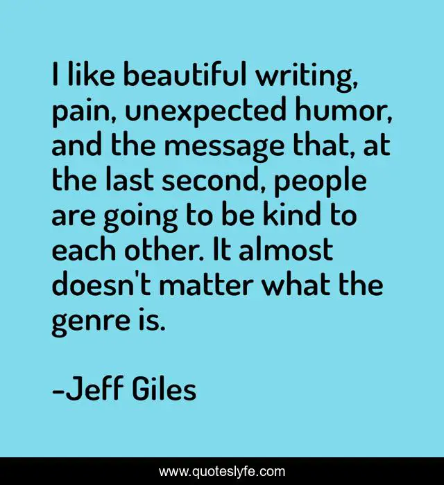 This page presents the quote "I like beautiful writing, pain, unexpected humor, and the message that, at the last second, people are going to be kind to each other. It almost doesn't matter what the genre is.". Author of this quote is Jeff Giles. This quote is about beautiful, be kind, pain,.