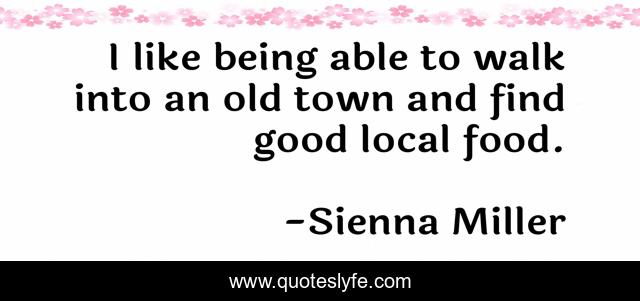This page presents the quote "I like being able to walk into an old town and find good local food.". Author of this quote is Sienna Miller. This quote is about good, find, walk,.