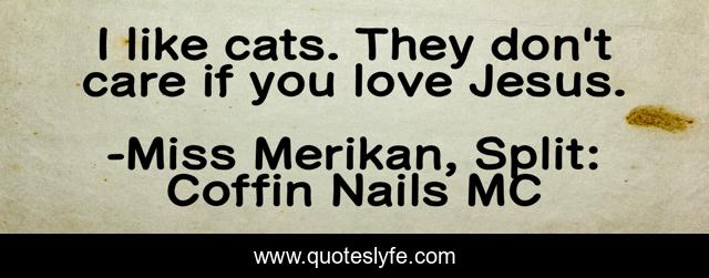 This page presents the quote "I like cats. They don't care if you love Jesus.". Author of this quote is Miss Merikan, Split: Coffin Nails MC. This quote is about funny, comedy, inspirational, enthusiasm,.