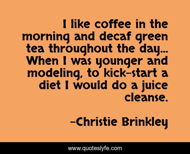 This page presents the quote "I like coffee in the morning and decaf green tea throughout the day... When I was younger and modeling, to kick-start a diet I would do a juice cleanse.". Author of this quote is Christie Brinkley. This quote is about coffee, green, day,.