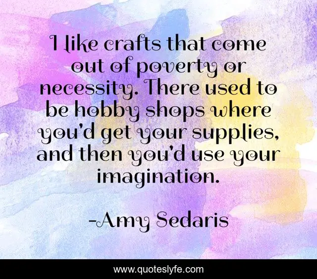 This page presents the quote "I like crafts that come out of poverty or necessity. There used to be hobby shops where you'd get your supplies, and then you'd use your imagination.". Author of this quote is Amy Sedaris. This quote is about hobby, poverty,.