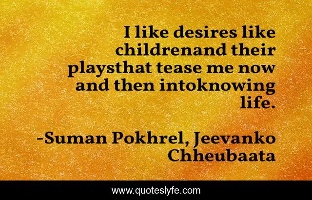 This page presents the quote "I like desires like childrenand their playsthat tease me now and then intoknowing life.". Author of this quote is Suman Pokhrel, Jeevanko Chheubaata. This quote is about life, desires,.
