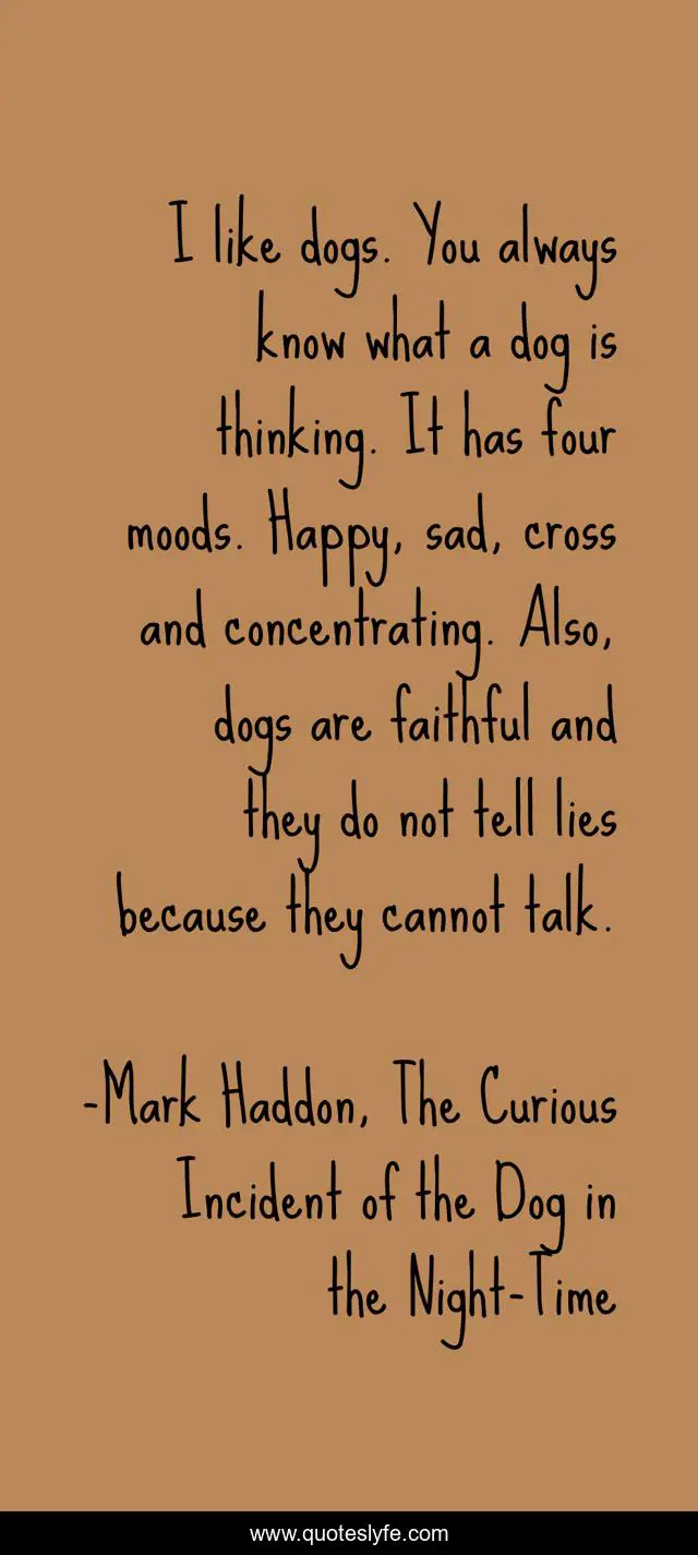 "Mark Haddon, The Curious Incident of the Dog in the Night-Time Quotes." Quoteslyfe.com, 2025. Mon. 08 Dec. 2025. <https://www.quoteslyfe.com/quote/I-like-dogs-You-always-know-what-229427>.