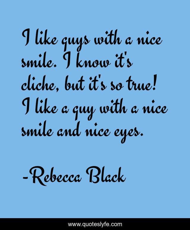 This page presents the quote "I like guys with a nice smile. I know it's cliche, but it's so true! I like a guy with a nice smile and nice eyes.". Author of this quote is Rebecca Black. This quote is about eyes, nice,.
