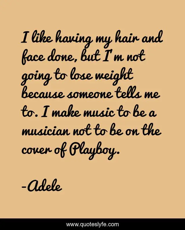 This page presents the quote "I like having my hair and face done, but I'm not going to lose weight because someone tells me to. I make music to be a musician not to be on the cover of Playboy.". Author of this quote is Adele. This quote is about hair, me, diet,.