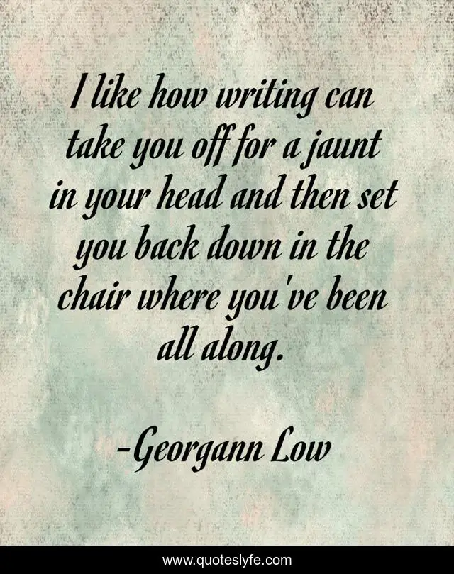 This page presents the quote "I like how writing can take you off for a jaunt in your head and then set you back down in the chair where you've been all along.". Author of this quote is Georgann Low. This quote is about spiritual-growth, gardening, how-to-meditate, lover, black-lives-matter, meditation, french-language, memoir,.