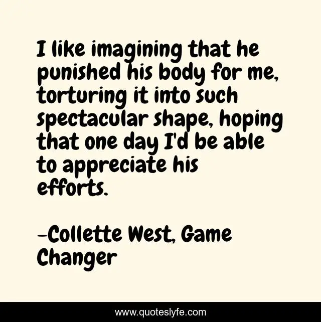 This page presents the quote "I like imagining that he punished his body for me, torturing it into such spectacular shape, hoping that one day I'd be able to appreciate his efforts.". Author of this quote is Collette West, Game Changer. This quote is about contemporary-romance, sports-romance,.