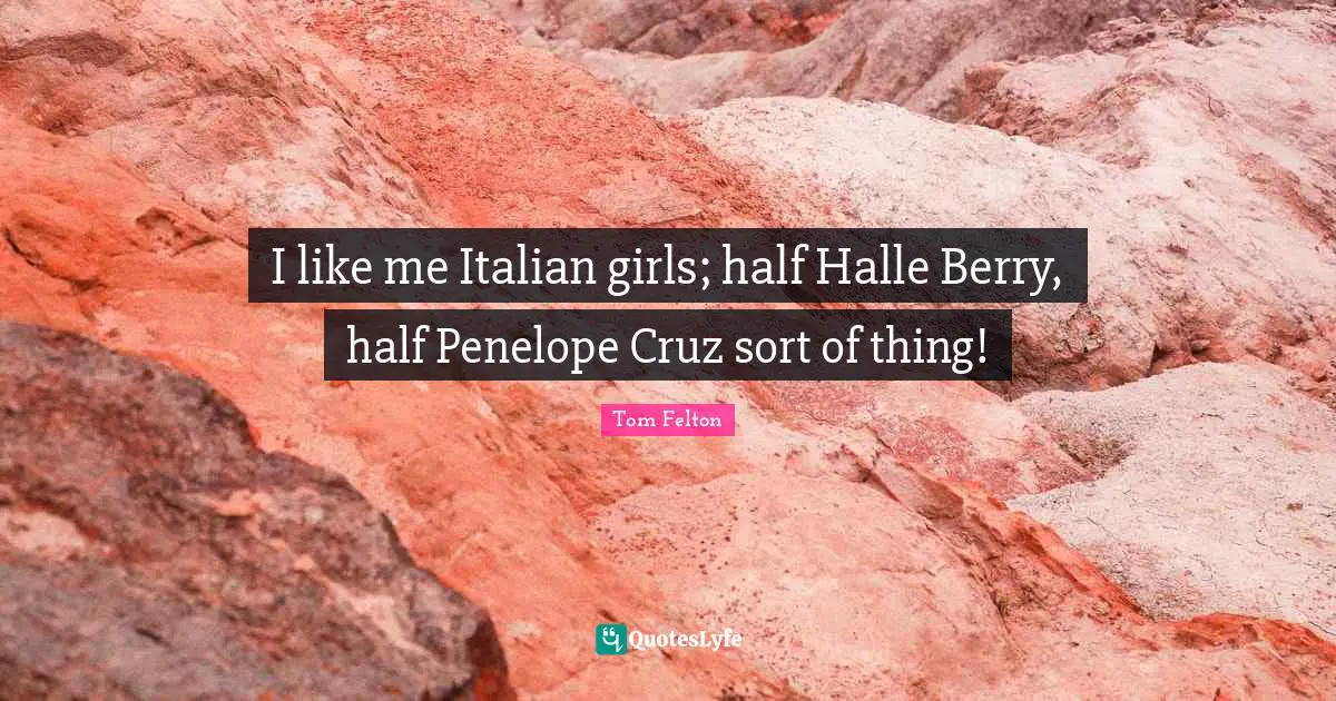This page presents the quote "I like me Italian girls; half Halle Berry, half Penelope Cruz sort of thing!". Author of this quote is Tom Felton. This quote is about half, like me, cruz, girl, italian, berries,.