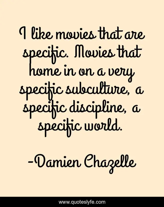 This page presents the quote "I like movies that are specific. Movies that home in on a very specific subculture, a specific discipline, a specific world.". Author of this quote is Damien Chazelle. This quote is about discipline, home, world,.